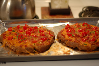 Tonight I made meat-zzas. They’re essentially pizza built on top of meatloaf instead of crusts. Lots of protein and LOW calorie count. And fabulously delish. The only thing I would consider doing differently next time is adding a salad to the plate (the meat to veggie ratio was a little lopsided).