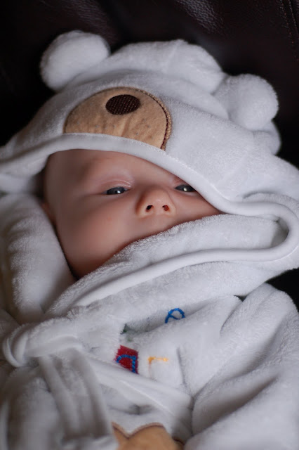 I didn’t get a chance to take a picture of Cam today, but since we had a bath tonight, I’ll show you a post-bath picture from a few weeks ago. If you think babies couldn’t get any cuter, just put them in a housecoat with bear ears.