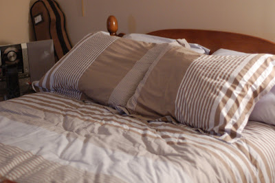 So, today, I was grocery shopping with Cameron at one of these Great Big Superstores, and I happened to be in the Bed and Bath section (because we needed a new shower curtain). While I was there, I saw sheet sets ON SALE. I picked up an 8 piece set (comforter, sheet, fitted sheet, dust ruffle, 2 pillow cases and 2 pillow shams) for way less than $100. As a bonus, I was able to pick a design that Dan would like too.